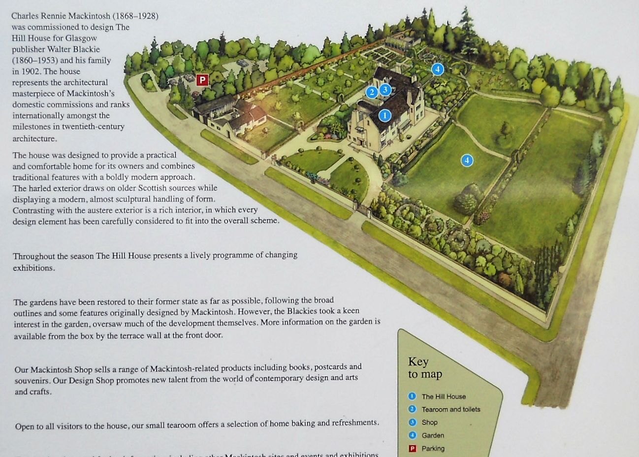 The Hill House was built in 1903 by Charles Rennie Mackintosh and is one of the best examples of his style. It is owned by the National Trust for Scotland and is a popular tourist attraction. |